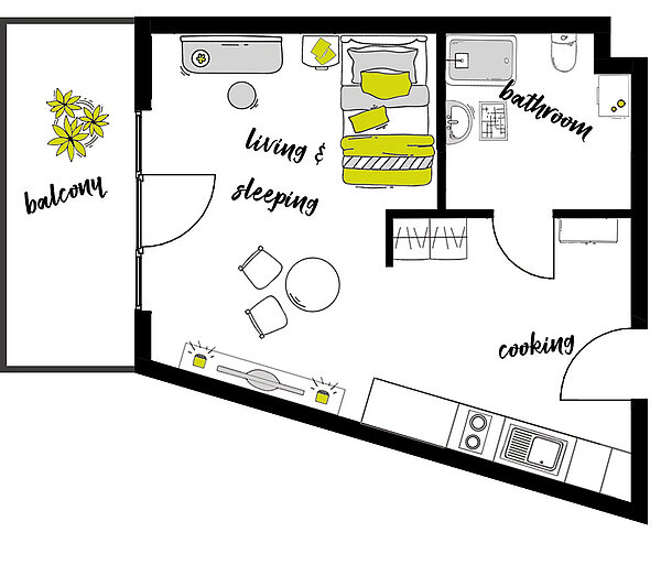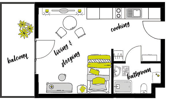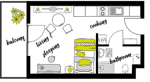 a well equipped kitchenette, a trendy bathroom, a cozy sleeping and living area in connection with modern network and communication technology guarantees an amazing living quality! And there is still enough space to give your room your very own style.